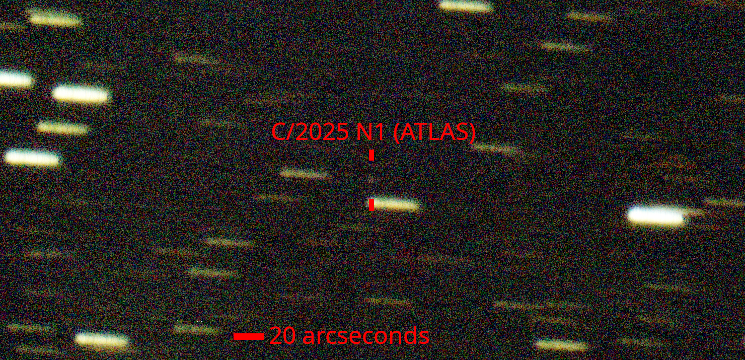 Labeled using it's provisional designation: C/2025 N1 (ATLAS) North is up. 0.35 arcseconds/pixel.