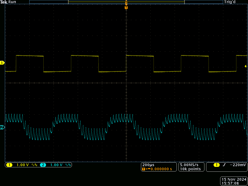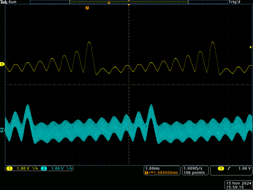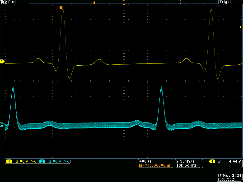 The yellow trace is the input, and blue is the output: