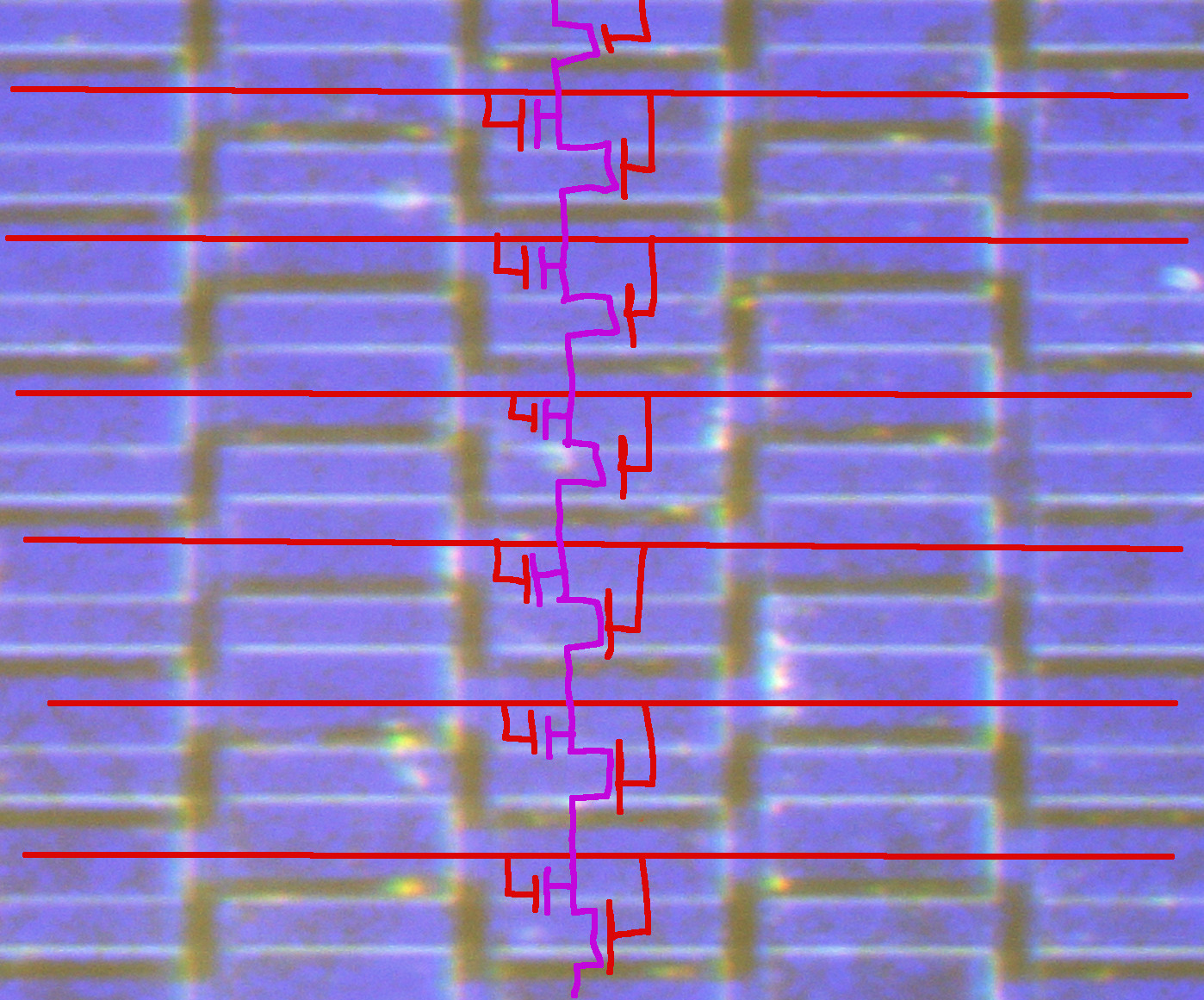 Most of the chip is n-type silicon, some regions have been converted to p-type, which is visible in the photo. The junctions between p-type and n-type junctions act as diodes, which will always be reverse biased becuase the substrate is connected to the highest voltage in the chip. Most of the silicon is covered in silicon dioxide, basically glass, which insulates it from the metal wires running over it. In these places, the p-type wells act as a separate conducting layer.