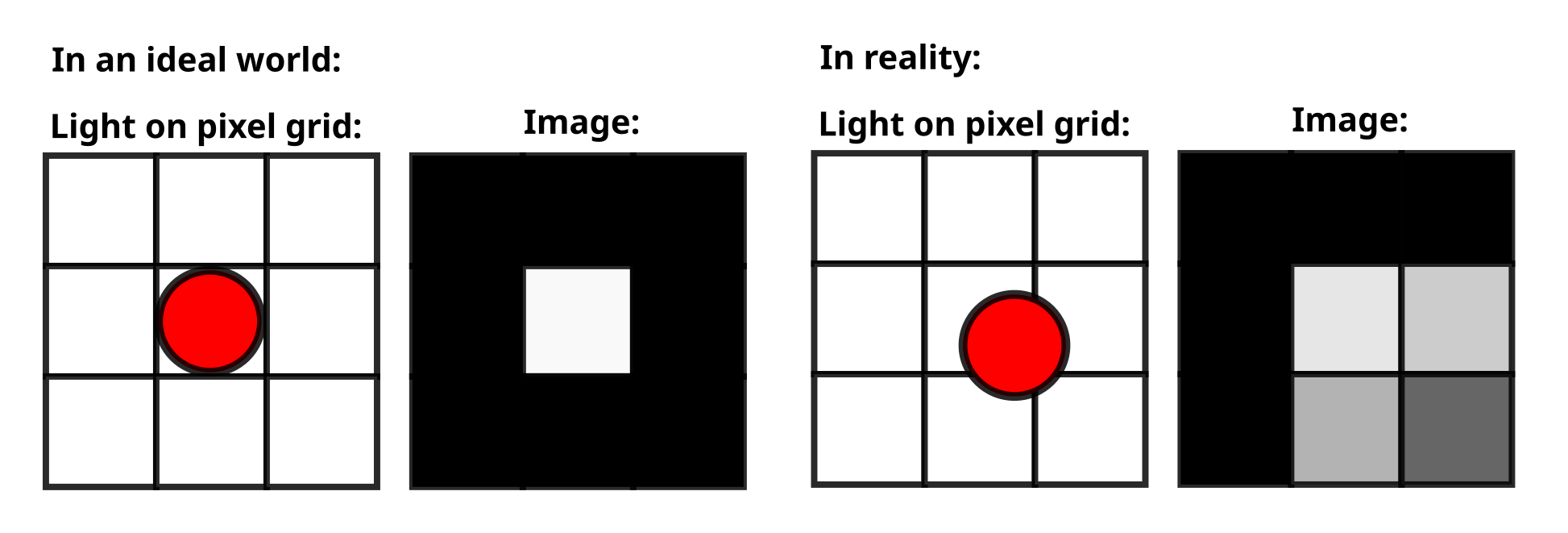 Another important factor is that color camera’s have approximately half the resolution you’d expect: Every pixel only sees a single color channel, so processing software has to interpolate between pixels to find the true color.