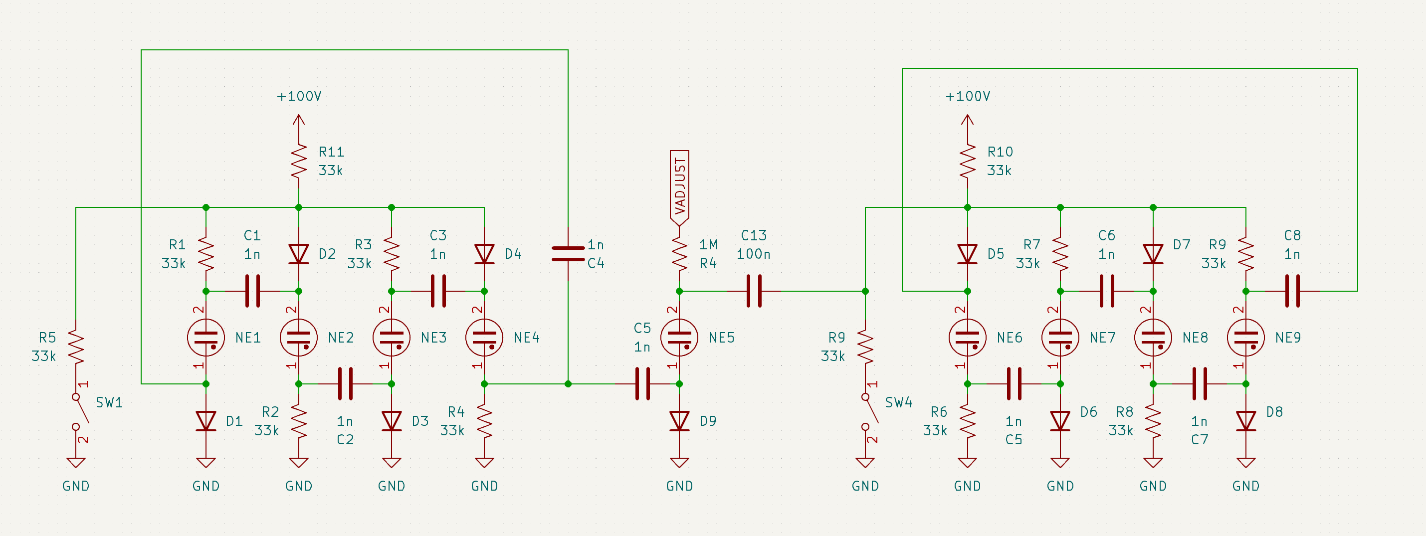 The amplfiers’s supply voltage has to be adjusted (this can be done with 100k or 1M potentiometer) to just below the striking voltage. When the counter stage on the amplifier’s input turns off, it creates a negative voltage on one side of the lamp, allowing it to light. Once conducting, the lamp continues glowing until it discharges the capacitor to below the maintaining voltage and goes out1. In the process, it feeds a much stronger pulse to the next counter then the one that triggered it.