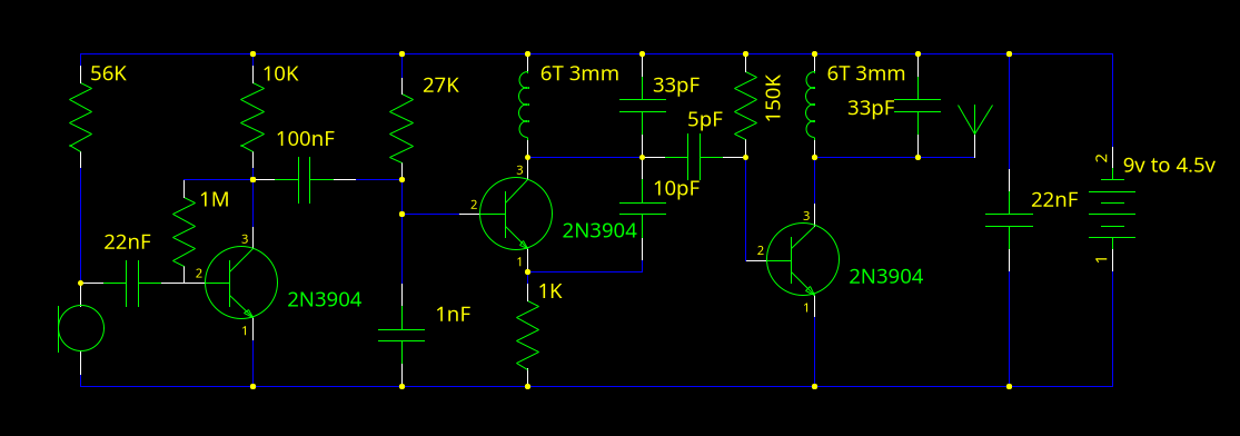 (RF)Here are the full schematics for a (slightly improved) FM bug and beacon with a class-C output stage described in the last post.