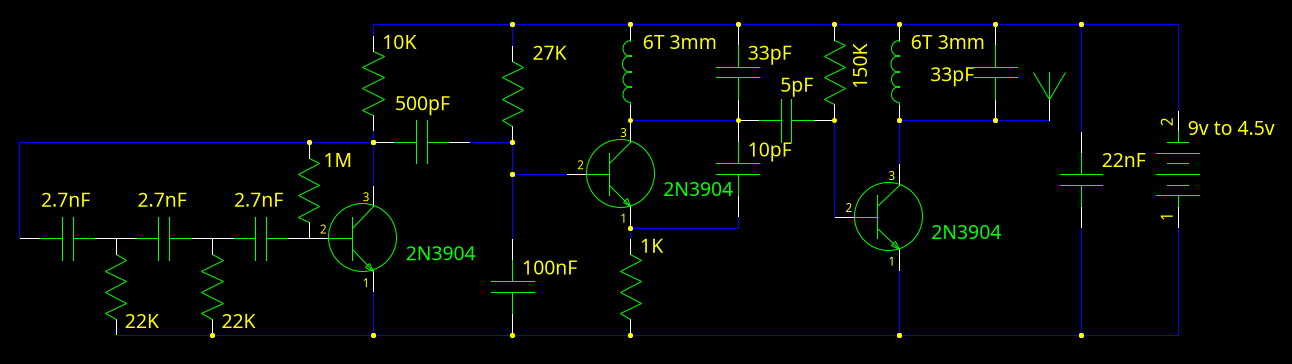 The improvements consist of 2 modified resistor values, the emitter resistor on the oscillator stage (Not much power is needed for the output stage), and the bias resistor for the amplifier.
